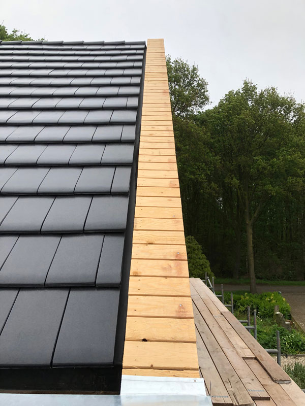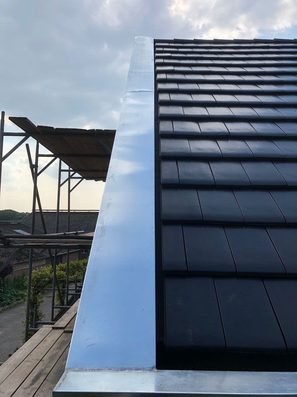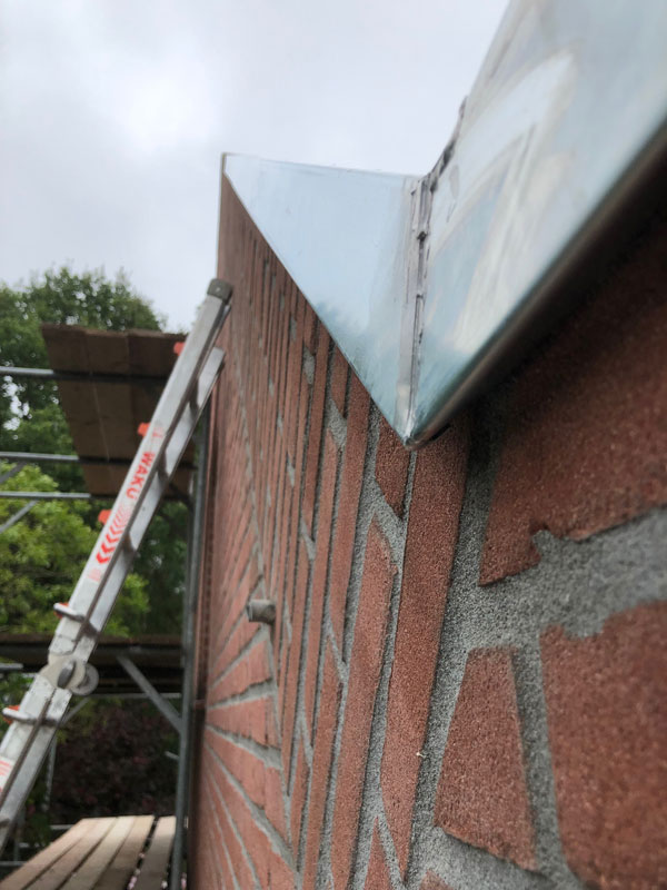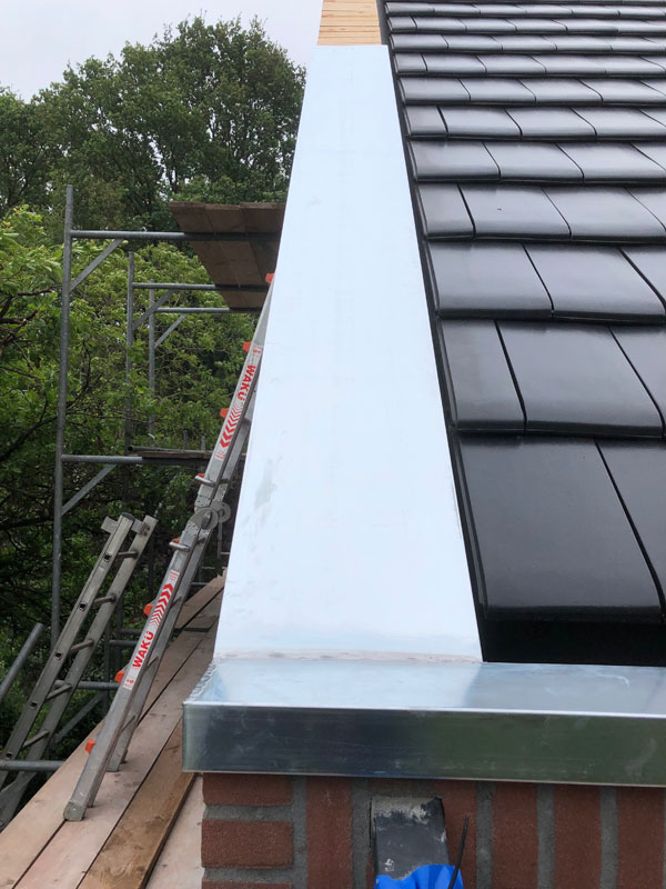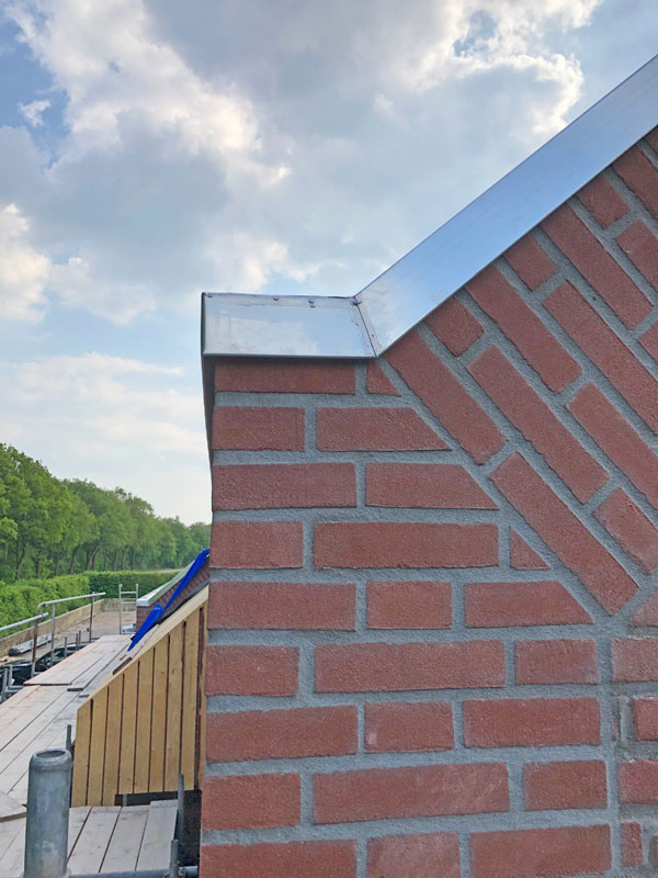 De bakgoot met EPDM bekleding en een zinken afdekking. Het timmerwerk voor de topgevel, gereed om zink aan te brengen. De bakgoot met EPDM bekleding en een zinken afdekking. Het aanbrengen van het zink op de topgevel. De fraaie zinken afwerking van de topgevel. We hebben altijd oog voor detail! We hebben altijd oog voor detail!
