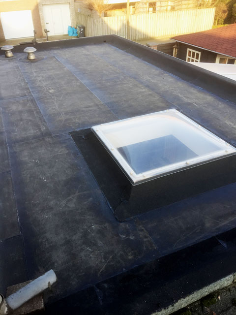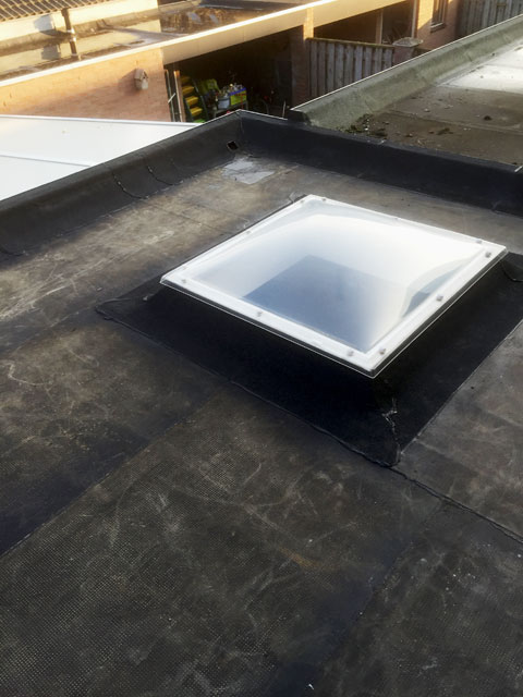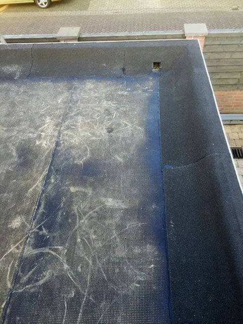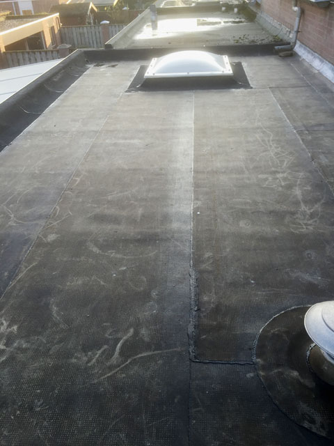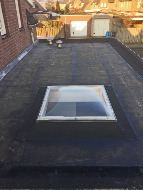 Renovatie van bestaand plat dak in Deurne, nieuwe bitumen laag over bestaande dakbedekking.