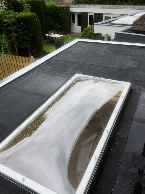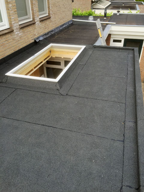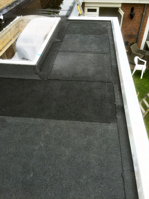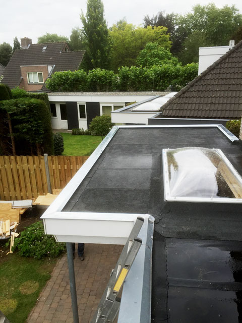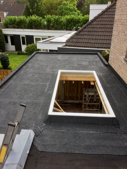 Bij een bestaande woning in Asten is de leefruimte uitgebreid met een overkapping, zodat de bewoners ook bij minder weer van de tuin kunnen genieten. Op het platte dak van de overkapping hebben we een PIR-isolatie aangebracht, daarna is het dak gedekt met een tweelaags bitumen dakbedekking. Voor extra lichttoetreding is in het dak een lichtkoepel aangebracht. De dakranden zijn afgewerkt met mooi strak zink.