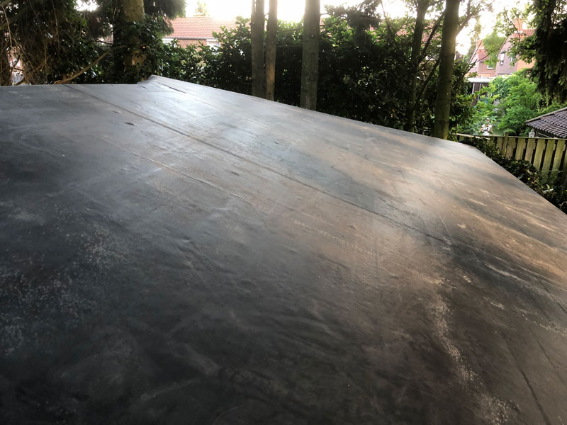 Plat dak van een aanbouw, PIR geïsoleerd en bitumen gedekt.